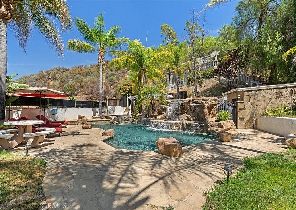 Floor-to-ceiling sliding glass doors open up to a spectacular resort-style backyard, designed and built by the original owners. This private outdoor oasis includes a built-in BBQ, covered patio, fire pit, and outdoor furniture included, making it perfect for relaxing or hosting guests year-round. The sparkling pool completes the space, creating the ultimate California lifestyle experience.