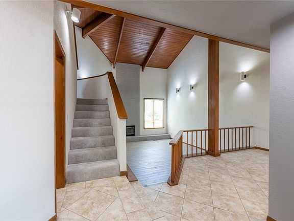 This STUNNING condo is perfectly situated next door to The Trails Clubhouse w/backyard views of the golf course! A 30+ foot Colorado-style wood beamed ceiling is the main attraction in the spacious living area. The living room also features a floor-to-ceiling brick fireplace, flanked by huge windows with views of the course and built-in bench seating, new wood-look tile flooring, a wet bar & patio access. The kitchen & dining area is open to & overlooks the living. Kitchen offers bar seating, a built-in desk, granite counters & plenty of storage. A large owner's suite offers a private balcony & two walk-in closets, plus an elevated whirlpool tub, walk-in shower, double vanities & built-in makeup counter in the private bath. The spacious 2nd bedroom also has a private bath. There is a huge storage/hobby room off the landing. An abundance of windows creates wonderful natural lighting. The patio is an amazing space to enjoy the mature landscape & seasonal views of the golf course!