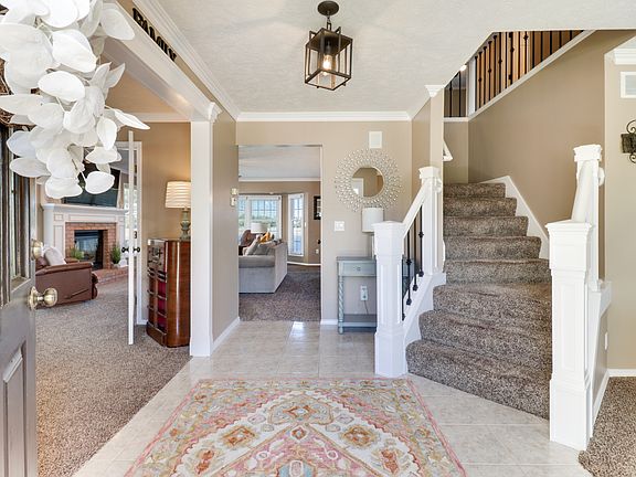 Indulge in lakeside luxury with this beautifully updated home in Eagle Creek. Situated on a tranquil lake, breathtaking views greet you from every angle. Modern elegance starts with charming curb appeal featuring tasteful color palettes and craftsman-style posts. Inside, meticulous attention to detail is evident with exquisite trim and crown molding. The main level boasts a formal room with French doors, a living room with a cozy fireplace, and an eat-in kitchen with lake views. A formal dining room and a first-floor laundry off the 2-car garage add convenience. The upper level offers four bedrooms, including a primary retreat with a walk-in closet and ensuite bathroom with dual vanities, a corner jetted tub, and a walk-in shower. The finished basement provides endless possibilities with a family room for movie nights, a separate office, and a full bathroom for guests. The expansive backyard oasis is ideal for outdoor living, featuring a deck, breathtaking views, and a private dock for direct lake access, perfect for kayaking, paddle boarding, fishing, or simply unwinding. Updates abound, enhancing both style and functionality. The roof was replaced in 2015, and six new windows were installed in 2023. The kitchen cabinets received a fresh coat of paint in 2022, along with the bathroom vanity. Trim and crown molding adorn both floors, added in 2022. Updated light fixtures were installed in 2021. A new stainless steel appliance package was added in 2024, along with window treatments in 2020. Experience the modern comforts harmonizing with natural beauty, creating a sanctuary you'll be proud to call home. Welcome to Lakeside Living in Eagle Creek.