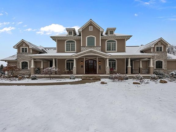 Come home to luxury country living in this beautiful hilltop custom home on 11 acres. This stunning 5 bed/4.5 bath home is in move-in condition with gourmet kitchen, custom cherry wood floors, and a generous master bedroom and bath on main floor. The two-story great room opens to the kitchen for easy living and entertaining. Upstairs are three large bedrooms, with one very large and perfect for a bunk room. Lower daylight level has custom home theater, another recreation room with a fireplace and is plumbed for a wet bar. Outside, the wraparound covered porch leads to a custom stone patio in the back with built-in grill and fire pit and plenty of room to add a pool. The custom four-stall horse barn is ready for your four-legged friends. Fenced pasture and gorgeous views of gently rolling land and woods make this a spectacular spot close and convenient to LaPorte, Michigan City, University of Notre Dame, and minutes from I-94. This is a spectacular property ready for you to call home!