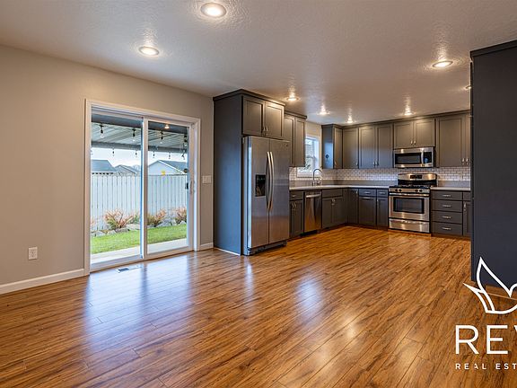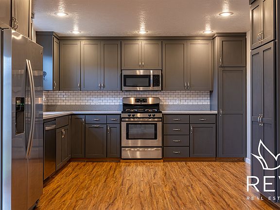 Discover your suburban bliss in the coveted Trailhead Subdivision! This meticulously maintained home has three bedrooms, two full baths and vaulted ceilings in the great room that amplify the sense of space. Enjoy the expansive kitchen and dining area, complete with custom countertops and sleek stainless-steel appliances. Retreat to the expansive master bedroom featuring a full ensuite bathroom and walk-in closet, ensuring both luxury and functionality. Convenience is key with a two-car finished attached garage and an additional utility shed providing ample storage. Backyard privacy is ensured by the encompassing wood fencing with dual gates. Delight in the ease of automatic sprinklers in the beautiful summer months and the added benefit of an RV parking space. This is a MUST SEE!