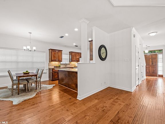 Do not miss your opportunity to make this quaint custom home community "your home". You will be welcomed onto the front porch where you can enjoy visiting with neighbors or just enjoy the sunshine and a rocking chair. Once inside, you will appreciate the smooth ceilings, crown molding and beautiful wood flooring that flow seamlessly throughout the living/dining/kitchen areas. Formal dining with crown molding and easy access to kitchen. Spacious kitchen has tile backsplash, solid wood raised panel cabinetry, under counter lighting, granite counter tops, recessed lighting, and breakfast area. Great Room has soaring ceilings, and gas log fireplace. Primary Bedroom will not disappoint--first floor and oversized with ensuite bath. Primary Bath has double vanity, garden tub, and separate shower as well at 2 walk in closets. Bedrooms 2-4 are all very spacious. First floor Office/Hobby Room and Laundry Room with mud sink and cabinetry. If privacy is a plus, this backyard is for you! Mature landscape, and a porch with additional decking allows for both covered and uncovered outdoor entertaining AND.....just bring the grill but leave the propane, because you already have a natural gas connection. Side facing oversized garage has built in storage, loads of concrete for several cars and for turning around in the driveway. New roof in 2018. Spanish Fort Schools. Convenient to schools, shopping and I-10. All information provided is deemed reliable but not guaranteed. Buyer or buyer’s agent to verify all information.