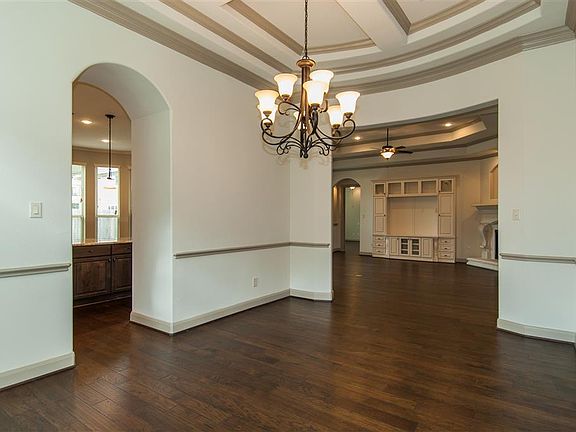 The dramatic single story Chaffee plan by Village Builders features a family room with fireplace and built-in shelves, formal dining room, kitchen with island and adjoining breakfast nook, study, powder bath, and a large covered patio. The master suite has dual walk-in closets and sinks, soaking tub, and shower. *Elevation D. Private swimming pool.