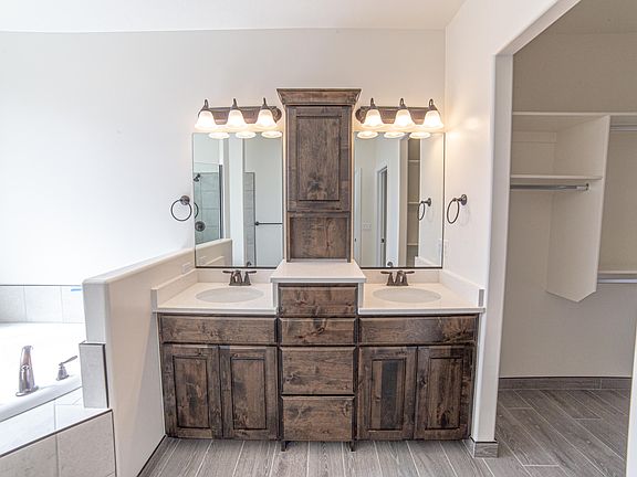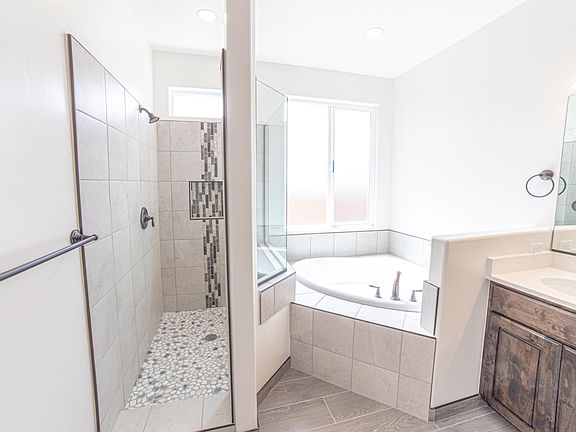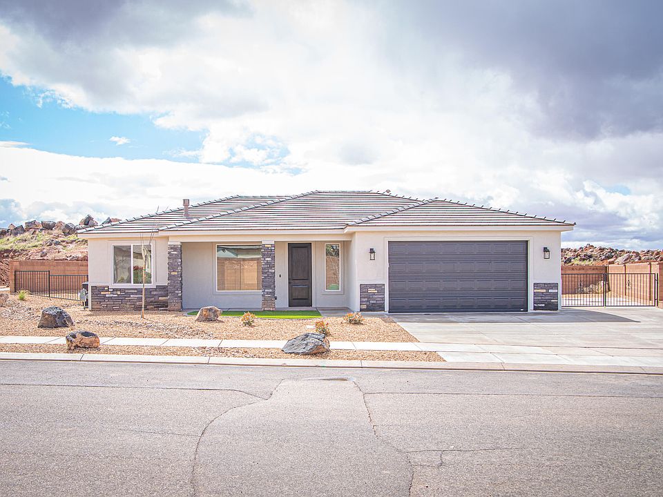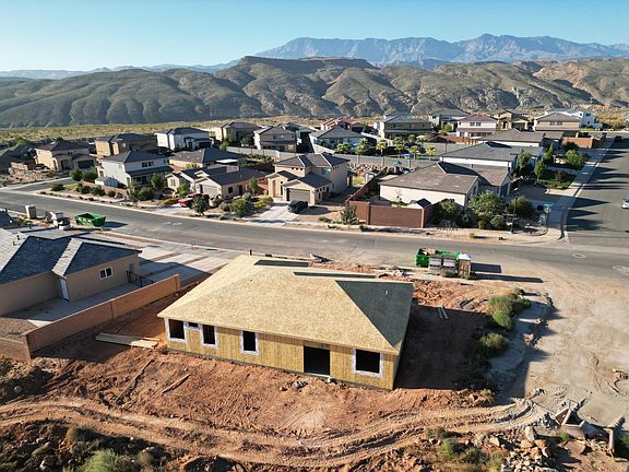 This open floor plan sits on a corner lot in a lovely, brand-new subdivision. View the snow-capped Pine Valley Mountains through the large bay window next to the rock fireplace in the great room! Comes with fully landscaped and irrigated backyard and covered patio, and an RV pad with full hookups next to the driveway! Owner's suite includes a tiled walk-in shower, large corner bathtub, a double sink set in lovely white quartz countertops as well as a walk-in closet. The guest bath also includes quartz countertops and a tiled walls around the shower and tub. Floors throughout the entire house are wood-grain tile, both stylish and super durable! Kitchen features quartz countertops, stained knotty alder cabinets with soft-close hinges and undercabinet lighting.