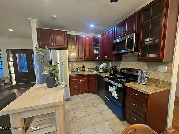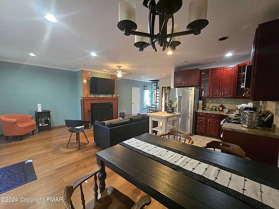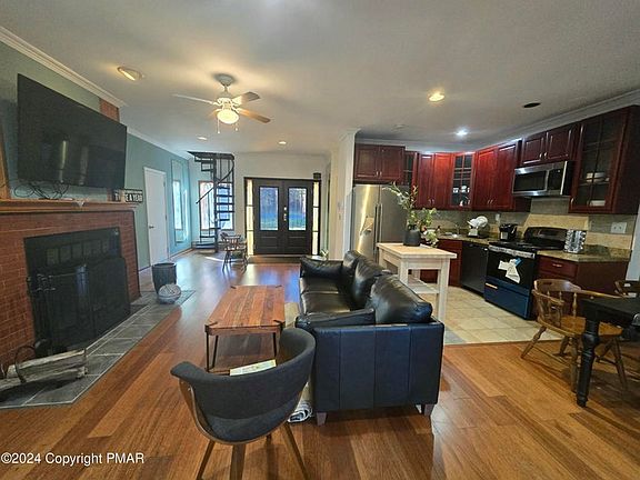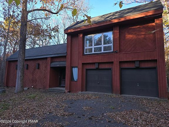 Nestled in the Stroudsburg School District within the Penn Estates community, this spacious home is conveniently located near the main gate. This unique floor plan features 3 bedrooms and 3 full bathrooms, Enjoy the option of two separate living arrangements to suit your needs, making it perfect for multi-generational living. On the main level, you'll find 2 bedrooms, 2 full baths, a fully equipped kitchen, a welcoming living room, and a bonus sauna for relaxation. The upper level features 1 bedroom, a full bath, another kitchen, and a cozy living area. You can access this space through a separate entrance at the rear of the home or via a stylish spiral staircase. Additional features include 2 large garage bays and 2 washer and dryer hook-ups. Can rent furnished or unfurnished.