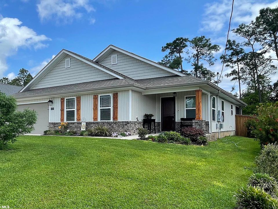BETTER THAN NEW! A lovely FLYNN BUILT, 3/2 craftsman cottage, only 2 years new with tons of wonderful upgrades. It's located within the new development of amenity-rich Spanish Cove, within a golf cart ride to Perdido Bay, minutes from a Pirates Cove cheeseburger or shopping and beaches! The America plan offers an open living/dining/kitchen area. The kitchen features an all stainless appliance package including range, dishwasher, microwave and refrigerator. Upgrades include lovely granite counter tops, tile backsplash and a breakfast bar. Step into the primary bedroom and bath combination to find a double vanity with shower/tub combo and a large walk in closet. You will find Coretec Pro Plus plank flooring throughout the entire home. It is complete with a wifi NEST thermostat and the HVAC was upgraded to an energy efficient 15 SEER heat pump. There is a home automation security system including touchscreen interface & panel with 3 door sensors, LED lighting throughout, Gold Fortified Certified Roof with gutters and hurricane fabric shield window protection. Other structural upgrades include extra attic and garage insulation, cordless blinds, a Solaris whole house air purifier. This property offers a 16 X 24 workshop with a 100 AMP service panel and a fish cleaning station with water. There is a separate drilled well providing water for the irrigation system. The home has a screened porch on the rear and a separate covered porch on the garage side of the home. Next to the side porch is a gated 14 X 38 concrete pad for you to park your boat or RV. A state of the art generator hook-up system was installed for power outages. The entire back yard is surrounded by a 6 foot tall wood privacy fence. As a resident of Spanish Cove, you will get to enjoy two Clubhouses, year-round pool, gym, private fishing pier, beach and picnic area, activities, 24-hour security patrol and more.