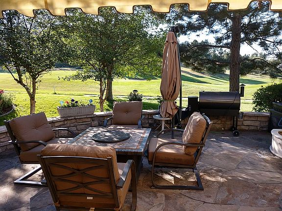 Ideal main floor master patio home with BEST location. Backs to 15th Fairway on Country Club at Castle Pines golf course, open space and total privacy/seclusion. Patio can be enjoyed all day long with good sun orientation and motorized awning. Flagstone and hardwood floors, high volume ceilings, three gas fireplaces with tasteful stone mantels/walls, plantation shutters and Smart Home features with Z-Wave automation. Impressive flagstone floor as enter two story living room with fireplace and views to golf course. Dining room, Butler's pantry and updated kitchen with stainless appliances. Kitchen flows into eating area and family room, all exiting to outdoors/patio. Master has two closets, laundry area, gas fireplace and door to back patio surrounded by open space. Huge basement with 10 foot ceilings, Wine cellar with flag stone floor, open room with pool table, huge T.V. area, serving counter, ice maker. Basement has two additional large bedrooms, full bath, laundry room with cabinets and laundry sink. House has radon mitigation system. Three car garage with windows, passenger door, large attic with ducts, lights, pull down stairs. So much storage available in this house and garage.