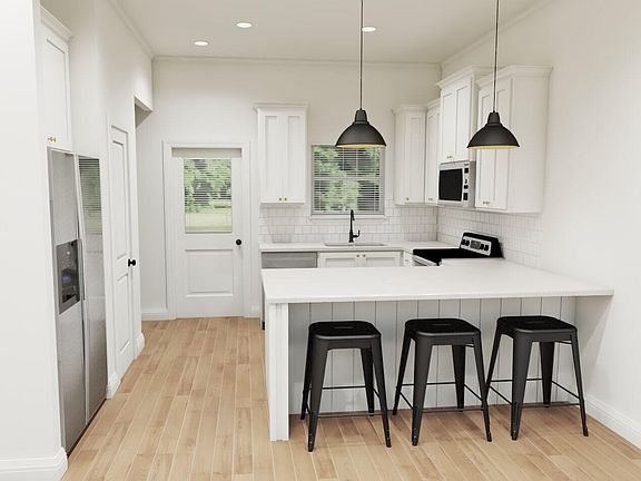 Introducing the epitome of comfortable living crafted by Sidar Builders! This stunning new-built home exemplifies modern elegance and comfort at its finest. Enter into the heart of the home, where an inviting open kitchen awaits, boasting custom cabinets, quartz countertops, stainless steel appliances, and stylish pendant lighting, creating a culinary haven that's both functional and exquisite. Entertain effortlessly in the open living/family room, bathed in natural light and adorned with vinyl wood plank flooring, leading seamlessly to the expansive covered patio, ideal for indoor-outdoor living and entertaining year-round. Retreat to the primary suite, featuring a tray ceiling with crown molding, large windows that flood the space with natural light, and a luxurious primary bath complete with a large shower, soaking tub, quartz vanity, and a spacious walk-in closet with built-in shelves for optimal organization. And with the spacious laundry room conveniently located off the primary closet, daily chores become a breeze. Two additional bedrooms offer ample closet space and built-in storage, sharing a second full bath adorned with a quartz vanity and tub/shower combo. Plus, the convenience of a half-bath with quartz vanity adds to the home's functionality. Enjoy modern amenities including a sprinkler system, privacy fence, and energy-efficient vinyl Low-E windows, ensuring comfort and sustainability.