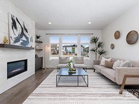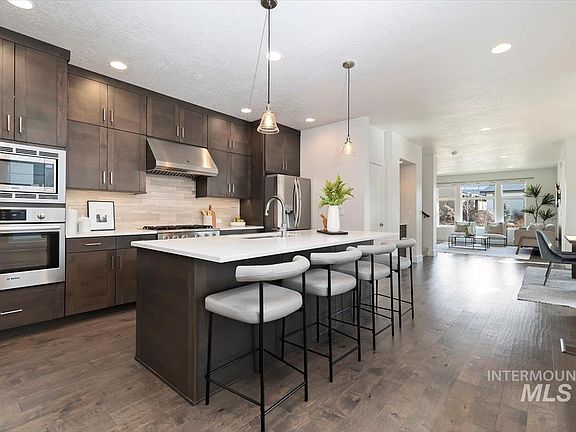 Experience modern elegance in the desirable Harris Ranch neighborhood offering amazing proximity to the rolling foothills, Boise River, hiking, biking, fishing, dining, community pools, and more! Striking copper eaves and a sophisticated stucco façade lead into a welcoming open-concept layout bathed in natural light. Great room accented by a stylish stacked stone fireplace surrounded by built-ins flows seamlessly into a chef's kitchen boasting stunning quartz countertops, a six-burner gas cooktop, and a spacious pantry. A dedicated tech nook on the main level provides the perfect space for working from home. Oversized fourth bedroom highlights breathtaking foothill views through expansive windows and would make an ideal bonus room or hobby space. Unwind in the luxurious primary suite featuring a double vanity, soaker tub, beautifully tiled shower, and a generous walk-in closet. End your day on the low-maintenance patio with ample space for hosting or relaxing.
