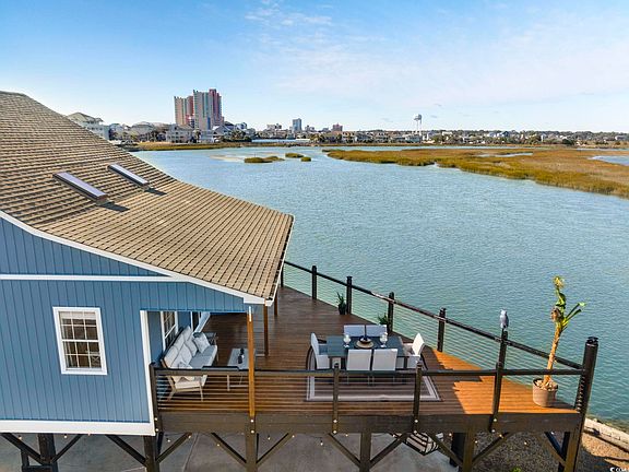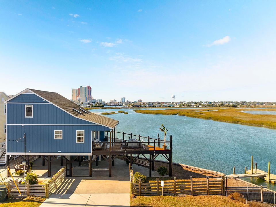 RARE END CHANNEL HOME WITH BEAUTIFUL PANORAMIC VIEWS! This 3 BR/2 BA raised beach home is situated at the end point of 42nd Ave N. in Cherry Grove on a channel and only 2 blocks from the beach. Take advantage of fantastic fishing, boating, jet skiing, and kayaking from your private dock. This property is set up as a pet-friendly home with a custom doggie door in the sliding glass door. The downstairs ground level is completely enclosed with fencing and there is an enclosed outdoor shower. NO HOA! No dredging assessment. Huge open deck perfect for entertaining or watching the Cherry Grove fireworks and sunrise/sunsets. Freshly painted and updated decor! This home is being sold completely furnished. This home will make a great primary home, 2nd home or investment property!