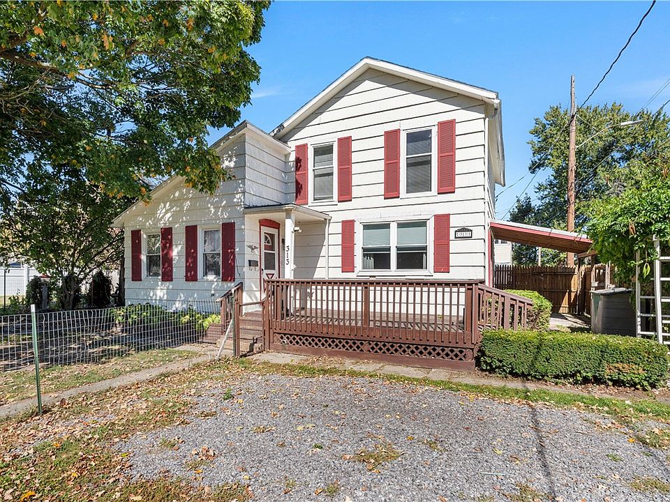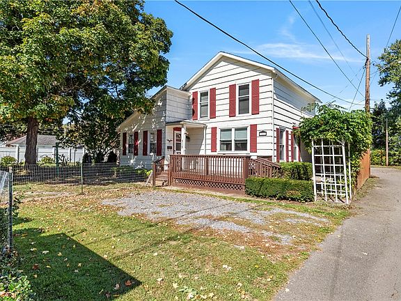 Cute two-story with one floor living! The main floor features a spacious living room with a nice hardwood floor covering. Also on the main floor is a formal dining room, a bedroom with a full en-suite bath, washer/dryer hookups, and a large kitchen equipped with a stainless steel gas stove, stainless refrigerator, and dishwasher. The W/D area (with hook-ups only) is in a cubby behind louvre doors in the kitchen. The home has vinyl replacement windows throughout and 8 yr old roof. 100 amp circuit breakers, a 1-year-old 40-gallon water tank and a FA furnace. There is an unheated 3-season room and a good-sized cold storage room. This property has an open deck and a very private covered patio area . There is an awesome, completely fenced side yard with a gazebo. There are two gravel driveways for off-street parking: one on Arlington Place and one on Mill Street.