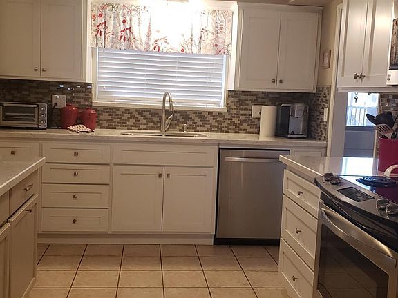 Updated and move in ready! This charming 3/2 has been lovingly cared for and has new kitchen cabinets with quartz counters + Stainless steel appliances, walk-in pantry and tile flooring. The master suite is complete with newer walk-in shower, quartz counter and also has his and hers closets. Down the hall are two additional bedrooms, storage closet and a full bathroom with new quartz counter. The rear of the property includes a large covered patio and separate 12x28 Man-Cave/She-shed/storage building. Single car garage, two additional storage rooms and very low maintenance front and rear yards complete this pretty package. This is a 55+ Community.