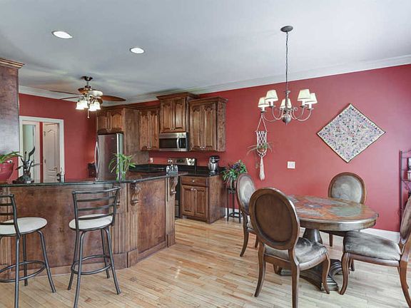 - RoomKitchenFeatures: Granite Counters, Eat-in Kitchen, Floors-Hardwood, Cabinets-Stained, Bar