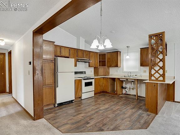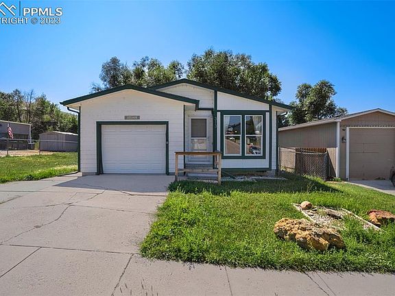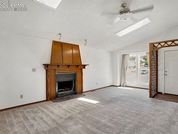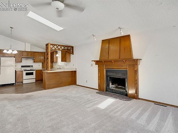 Welcome home to this move in ready ranch style home in Fountain, CO. As you open the front door you will feel welcomed by the wooden mantle of the fireplace, whose golden oak color matches the wood accents through-out the home. The open kitchen design allows it to be the center of entertainment and activity for the home. Down the short hallway you will find the three bedrooms. The primary bedroom has an ensuite bathroom with a double vanity. With skylights throughout the home there is an abundance of natural light. The home is located within a short drive of the Fountain Creek Nature Center, Gate 20 of Fort Carson and I-25, providing convenient access to shopping and restaurants. This home is waiting for your finishing touches.