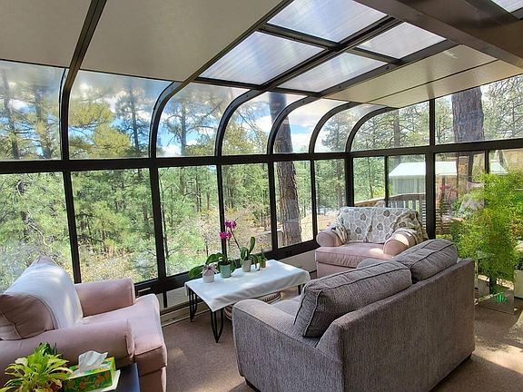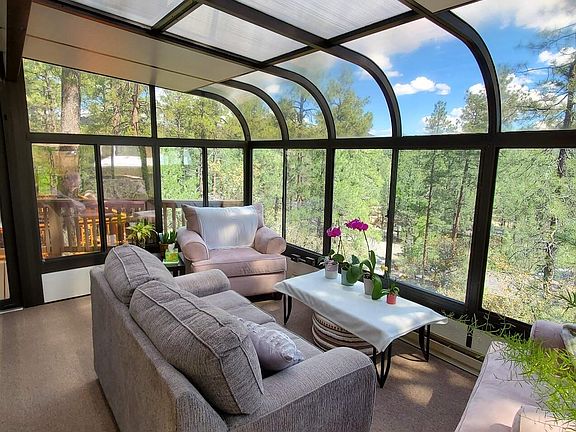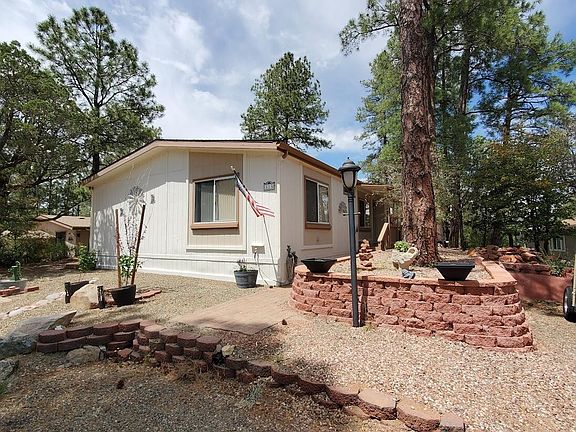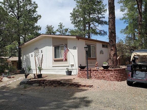 Located in Pine Lakes, a Senior 55+ community in the Prescott National Forest, this 1987 property features 1,887 sq.ft. with 2 bedrooms and 2 full bathrooms and office/den with skylight, plus 2 bonus rooms for crafts, added office, or just relaxing. The spacious living room comes complete with a gas fireplace. The kitchen features Whirlpool appliances and granite counters, a water filtration system, and separate laundry room. The master bedroom is large enough for a California king bed with room to spare. An en-suite bathroom includes double sinks, a jetted tub, separate shower and a large walk-in closet. The second bedroom has easy access to the second full bathroom. Watch the sunrise and sunset from your glassed atrium looking into the middle of tall trees and out to Granite Mountain.