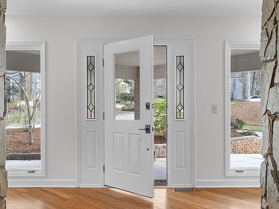 An architectural delight - hard to find contemporary design minutes to downtown Cary. Accented hand crafted stone columns frame the inside entrance highlighting a two story family room with casement windows and a stone fireplace. This is a well cared for home featuring new interior and exterior paint, quartz countertops in the kitchen and owner's suite bathroom. Bamboo floors in the foyer, family room and all bedrooms. Large two car side entry garage plus a porte-cochère at the front entrance. Oversized deck and a fenced in back yard.