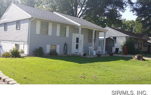 Split bedroom and floor plan in a desirable area located on the east end of Belleville near Scott Air Force Base, shopping, and highways. Walk out of the French doors, opening to the deck ('03), accessing the flat, over-sized lot that is ready for a pool/hot tub with room left over for yard games. Enjoy evenings on the covered porch. Tons of updates, including brand new roof, gutters, siding 2013. Newer furnace and air conditioner in 2011. Electric box and GFCI's in 2003. Bathroom was remodeled in 2003, including tub, sinks, flooring, toilet, and fixtures. New screen and decorative front door. Plenty of parking with the newer concrete driveway that fits 4 cars. Kitchen has a great view of the back yard. Enjoy meals in the connecting dining room or at breakfast bar/ island. Gas hook up at electric stove fir easy conversion. Plenty of room in the walk out lower lever for entertainment and over night guests. Plumbed for 2nd bathroom.