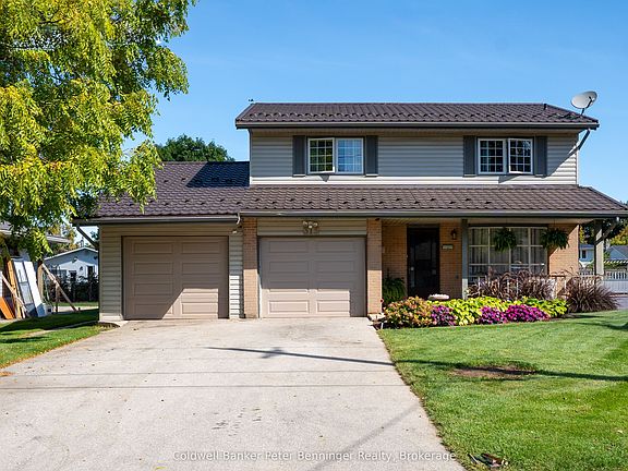 Welcome to this stunning 5 bedroom, 2.5 bath home nestled on a beautifully landscaped lot just three blocks from the sandy beaches. Located in a quiet, family friendly neighbourhood, this property is just steps away from a playground and scenic walking park + trails, offering the perfect blend of relaxation and convenience. The upper level features 4 spacious bedrooms, including a bright and airy primary suite, along with a full bathroom. Ideal for a growing family or hosting guests. On the main level, enjoy an open concept layout that seamlessly connect the modern kitchen, dining area and living room. A stylish 3-way natural gas fireplace adds warmth and ambience, perfect for cozy evenings or entertaining. Sliding doors off the eating area lead directly to the private backyard oasis, complete with an in ground pool that has a 10' deep end and a 3.5 foot shallow end. Additional features include an attached double car garage, offering plenty of storage space along with 2 tool sheds. Generator is connected to everything but dryer and oven. The two way fireplace on main level + the gas fireplace in lower level heat the home. Present Seller rarely uses the electric heat.