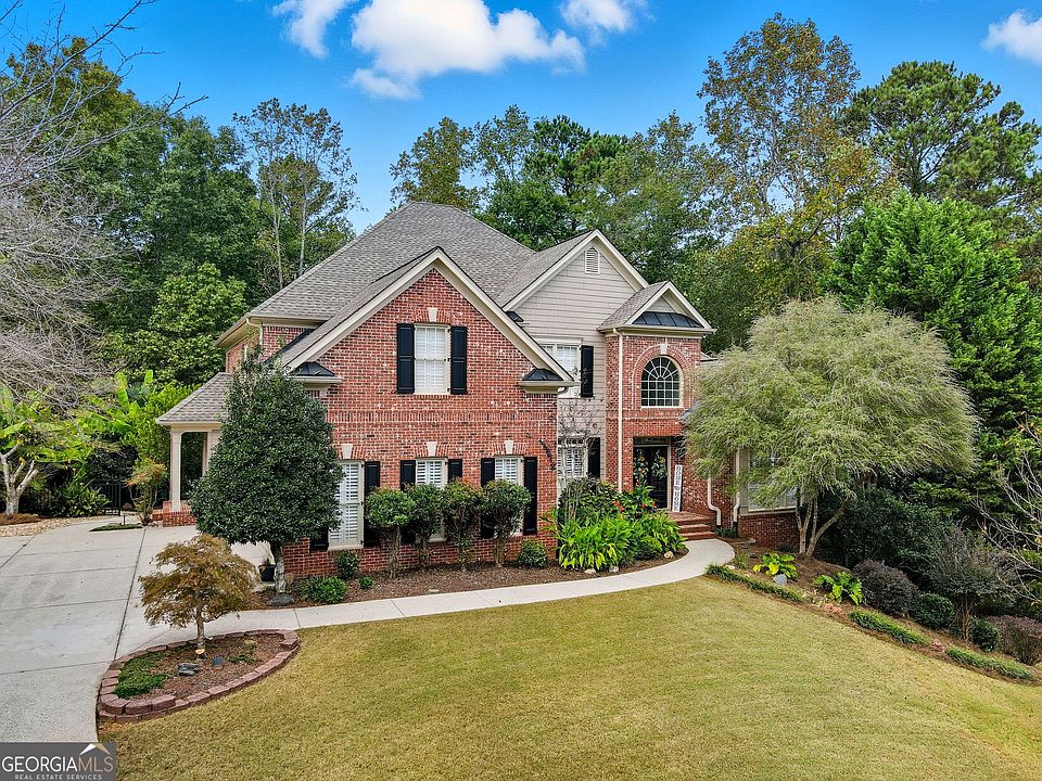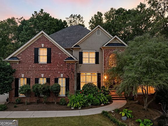 An engaging masterpiece in beautiful Bridgemill Golf & Country Club sits beautifully on the golf course in a quiet cul-de-sac. This exquisite home on just under an acre offers total privacy. Inside, the residence reveals extraordinary craftsmanship, double story foyer, a beautiful combination of genuine hardwood floors and new carpet, an office/library with French doors, plantation shutters throughout the entire home, a double story great room that lets all the natural light in, with stone fireplace and flanked by built-in book cases to start. The kitchen being the heart of the home offers seamless functionality with granite counter tops, coffee bar, walk-in pantry a large island, dinette area and keeping room with stone fireplace, and beams. To finish off the area, a screened in porch bringing the outdoors in. The large primary suite is on the main with tray ceiling, a door out to the back deck which is wooded to the golf course. The primary bath is a spa offering double shower heads, a freestanding soaking tub, double vanities, and his and her custom closets. As you head upstairs to second floor there is a loft area and 4 spacious bedrooms, with private sink areas in each room, then sharing shower and commode. The basement offers a true movie theater with custom theater curtains a sitting area for cards or board games. A pool table or ping pong room with a bar, a primary sized bedroom with fireplace a mini wet bar area and two workout centers. The estates complete livable outdoor terrace level also awaits detailing its finished off pillars, under decking, tiled patio and textured concrete and all anchors an amazing aquatic environment. A natural stream like water feature cascades into the pool completing the sounds of being outdoors and a jacuzzi hot tub completes the experience. Sitting on the golf course this home offers the perfect blend of seclusion and convenience, with a beautifully updated interior, spacious living areas and room to roam both inside and out. Shopping the outlets and commuting made easy with the Peach Pass.