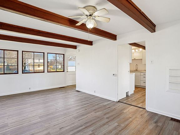 This updated two-bedroom, one-bathroom house would make a great starter home or investment property! The spacious living room has continuous flooring and beams that flow into the kitchen and dining area. An updated kitchen is equipped with stainless steel appliances, white cabinets, and access to the backyard. The full bathroom is freshly updated from the vanity to the tile in the bathtub surround. Upstairs the two bedrooms are carpeted and offer ample closet space. The washer and dryer are in the unfinished basement, including additional storage space. Enjoy a fenced-in backyard with mature trees in a spacious corner lot. Located in the Unit 7 school district, check out all this house has to offer!