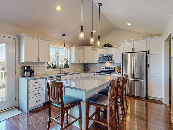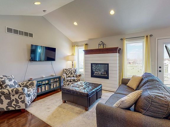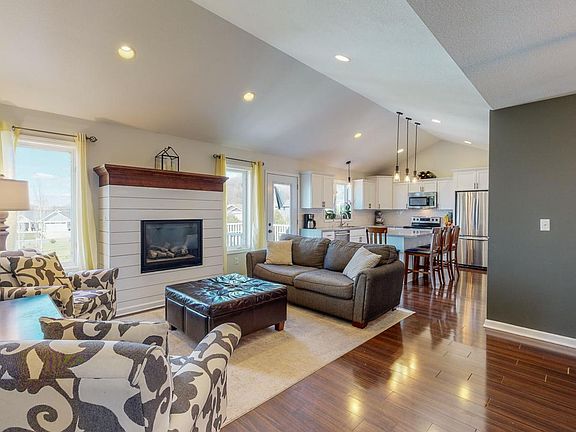 This stunning rambler boasts 4 bedrooms and 3 bathrooms, along with a spacious 3 stall garage. The luxurious master suite comes complete with dual sinks and a large walk-in closet. The kitchen is a dream with stainless steel appliances, high-end quartz countertops, and a kitchen island perfect for entertaining. The house features solid oak 6 panel doors, vaulted ceilings, and a cozy gas fireplace with the convenience of main floor laundry. You'll love the deck and large patio, perfect for enjoying the outdoors. Located in a fantastic neighborhood, this home is truly a must-see.