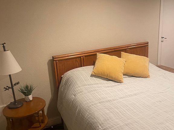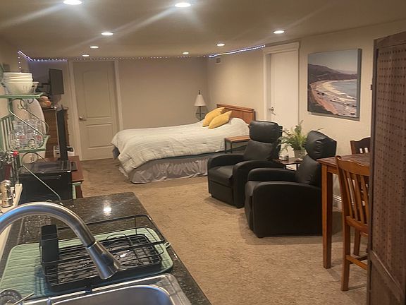 500 square-foot game room that's been turned into a rental space. Has a kitchenette with a small refrigerator microwave and toaster oven. Fully furnished. Has its own entrance. Queen size bed, 2 recliners, large screen, TV, kitchen table, private bath room with bathtub and shower, private patio. $1500 deposit that includes the cleaning deposit and last month's rent. Absolutely no smoking. You can have a small dog or a cat as long as they are housebroken and well-trained; there is a $500 deposit for animals. The parking is on the street right outside the house. The room has its own separate entrance, or you can come through the front door.