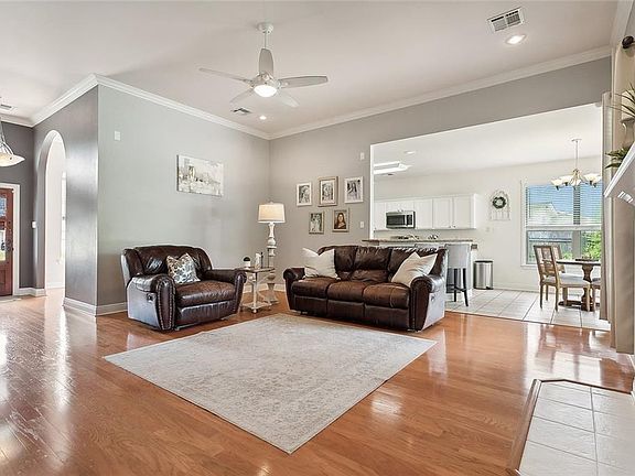 Just in time for summer!! Wouldn't you love relaxing in an outdoor oasis with inground pool/hot tub? That is just a part of what this four bedroom two full bath home has to offer. The spacious den with engineered wood floors allows multiple configurations of your furniture and features a gas fireplace with attractive mantle and tile hearth. The kitchen has stainless steel appliances, gas range/oven, undermount sink, tile floors and pantry. You can entertain in the formal dining room (also with engineered wood floors) and crown molding or enjoy a casual meal in the breakfast room overlooking the pool. You will enjoy spending time in the primary suite with trey ceiling. The primary bathroom has double vanities, upgraded fixtures, hydro tub and separate walk in shower. There are three additional nicely sized bedrooms. Work from home or just need a private space? The home also features a private office. Other extras include a 90 x 140 fenced lot, 400 square foot patio for entertaining and relaxing. Worried about insurance? The roof was installed in 2021 and the home is in Flood Zone C. It also has a 5 ton HVAC unit installed in 2021. Another big bonus is the Generac Liquid Cooled 22KW WHOLE HOUSE Generator. Make your appointment today!