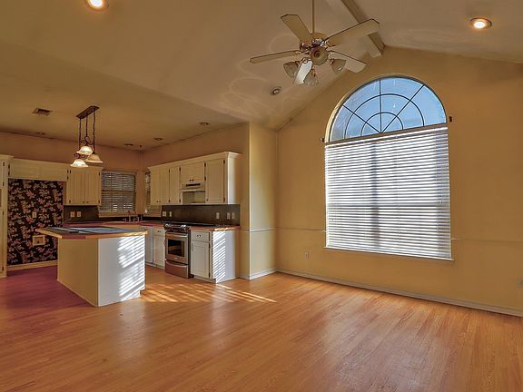 The welcoming family room sets the tone with its elegant tray ceiling, cozy wood-burning fireplace, and attractive open shelving. Just off the main living area, the oversized eat-in kitchen offers an ideal gathering space with its large island, pantry, and abundant cabinetry, while the spacious utility room provides convenient gas or electric dryer hook-up. The home features three comfortable bedrooms and two full baths, including a well-appointed primary suite with a tray ceiling, his-and-hers walk-in closets, a soaking tub, separate shower, and double vanity. The additional hall bath includes a tub/shower combo for added functionality. Outdoor living is easy in the privacy-fenced backyard, and the attached 2-car garage offers secure parking and extra storage.