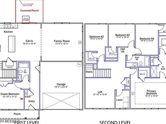This Russell plan features five bedrooms and three full bathrooms and a loft area. There is a guest suite off of the entry. The kitchen boasts a large pantry and island overlooking the eat-in area and family room. This main living space is expanded with a covered porch out back. The upstairs primary bedroom has dual walk-in closets, and the large bathroom features an over-sized linen closet. All three upstairs secondary bedrooms feature walk-in closets, and the laundry room is also conveniently located adjacent to the bedrooms.
