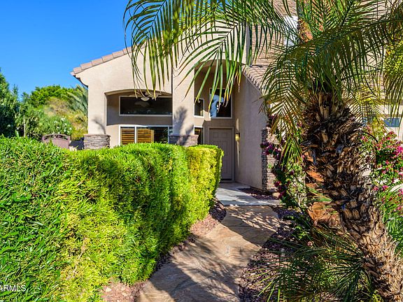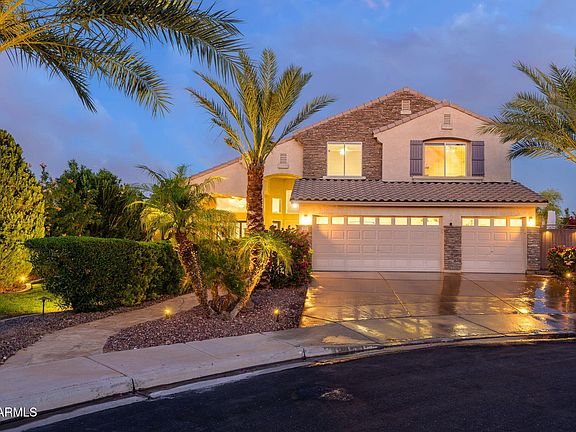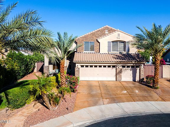 BACKYARD DREAM OASIS - OVER $235K IN IMPROVEMENTS! Step into your private resort-style retreat, designed for year-round entertaining and relaxation! The heated pool & spa sparkles with stunning glass tile and a tranquil water feature, all surrounded by travertine pavers that lead to a massive BBQ island, gas fire pit, and lush tropical landscaping. Enjoy seamless indoor-outdoor living with a large covered patio, motorized shade screens, misting system, and even an outdoor bathroom & tiki changing hut—perfect for hosting unforgettable gatherings.Nestled on a cul-de-sac lot, this home boasts incredible curb appeal, a freshly coated driveway, grass yard, inviting front patio, and a 3-car garage with epoxy-coated floors. Inside, this 4-bedroom + den, 3.5-bath, 2,512 sqft home impresses with a bright and airy kitchen featuring white cabinetry, granite countertops, and a cozy breakfast nook overlooking your backyard paradise. The formal dining and living rooms, plus a downstairs den, full bath, and laundry room, add functionality and charm. Upstairs, the primary suite offers a private balcony with serene backyard views, along with a luxurious bath featuring a large walk-in tile shower, dual sinks, and a spacious walk-in closet. Don't miss this rare entertainer's dream!