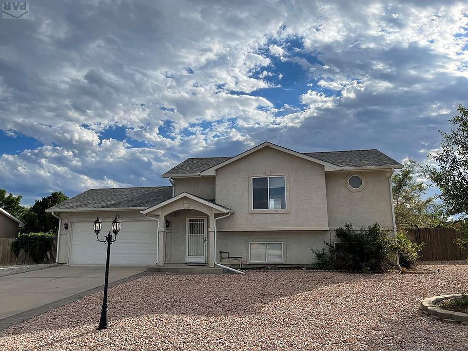 Great Bi-Level home open layout on the Upper Level, with the Kitchen being center. Appliances are included. Spectacular views from the Upper Level deck. Big Living Room. Master Bedroom has a private Full Bath and an oversized closet. Lower Level has a big Family Room and 2 bedrooms. Laundry is located in the Lower Level. Back yard is a blank slate to customize as you see fit. 2-car Garage exits to the back yard as well as directly into the front entrance. Quiet street, and no neighbors directly behind the house. Seconds away from the Pueblo West Fire Station and Emergency services, library, shopping, and recreational facilities.