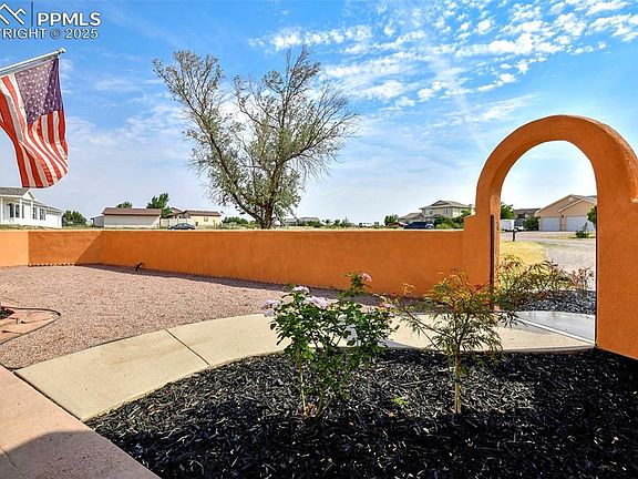 Santa Fe–style home on 1.03 acres in Pueblo West Acreage with million-dollar views backing to Walker Ranch for ultimate backyard privacy. True to its southwestern charm, this home features a welcoming courtyard, stone paths, rock accents, a lovely garden area, and a covered back porch offering views of the meadows & the mountains beyond. A separate seating area with a chimenea is perfect for enjoying warm Colorado sunsets. Inside blends classic style with multiple modern updates, offering nearly 1,900 sq. ft. of comfortable living space. The spacious living room centers around a wood-burning stove, while the kitchen offers a raised breakfast bar, abundant cabinetry, pantry, and nearly new appliances. The dining area opens to the back porch for seamless indoor/outdoor entertaining. The primary suite includes a 5-piece bath with walk-in shower, a large walk-in closet, and its own access to the back porch. Two additional bedrooms share a full bath—ideal for guests, an office, or studio. The 2-car attached garage includes abundant cabinetry and a work area. There is a 12' x 16' storage shed with small carport; you can never have too much storage. Located in a quiet neighborhood with easy Highway 50 access to Canon City or Pueblo. Offering timeless style, privacy, and unforgettable views.