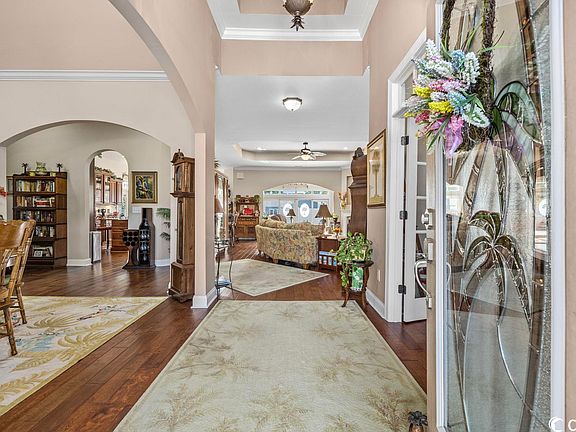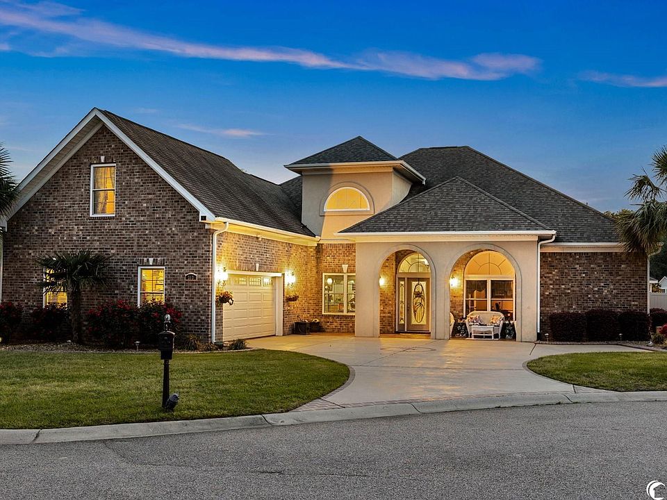 Custom all brick home with a gorgeous in-ground pool in the highly desired Pelican Bay neighborhood. Amazing curb appeal with a stamped concrete driveway & mature landscaping. Enjoy the quiet cul-de-sac location on a lake. This home has an open floor plan that features 4 bedrooms, 3.5 bathrooms, an office with French doors, a formal dining room with a vaulted ceiling, great room with a fireplace and a sunny Carolina room which leads to an incredible backyard oasis! Crown molding throughout the home with 12ft ceilings. The kitchen features custom wood cabinets, stainless steel appliances, gas stove, granite countertops, an oven/microwave wall unit and a work island. Exquisite hardwood floors run throughout the main body of the home including the master bedroom & the stair risers. The large master suite features a walk-in closet, tray ceiling, sitting area and a private door to the pool & patio area. The spacious master bathroom has a custom tiled walk-in shower & soaking tub. The pool area has it all! Privacy fence, stone tile surround, two retractable awnings, built in pool sprinklers, raised hot tub with waterfall feature, sitting area in the pool with a cocktail table, covered patio area for dining & grilling, and a storage shed to hide all the mechanical & pool tools. There are three entrances to the pool area, one from the kitchen, the quad sliders in the Carolina Room & the master suite. Pelican Bay is a highly desired gated community located on the Intracoastal Waterway. Pelican Bay has a community boat dock/ramp & boat parking. Best of all you are only four miles to North Myrtle Beach Main Street entertainment & restaurant area plus the fabulous North Myrtle Beach sandy beach!