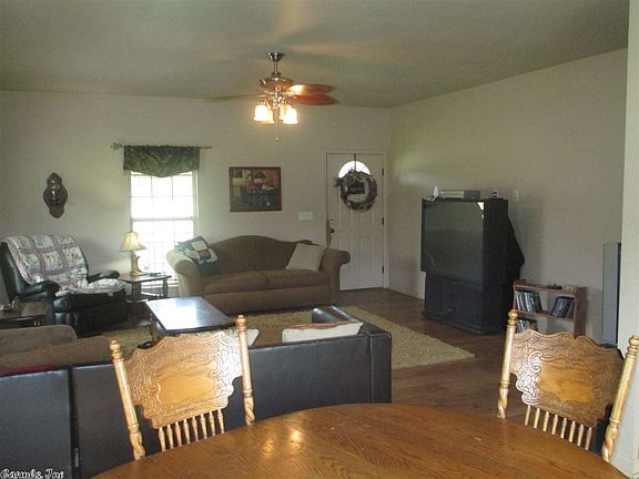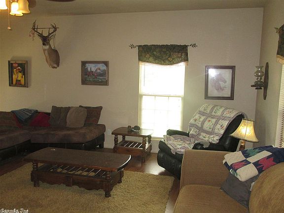 All electric Three bed, two bath log siding house with metal roof with large front porch & back patio. Nine foot ceilings in every room, dining opens into living room, refrigerator stays, walk in closet in master is also a safe room. Fenced & cross fenced with pond, chicken coop area, stalls for animals, shop & storage. Country living with no back door neighbors & room for your livestock, pets, chickens & farm animals. SELLER DOES NOT OWN ANY MINERALS.