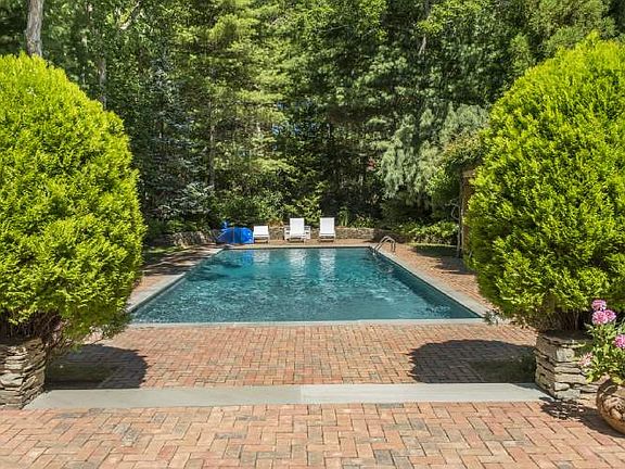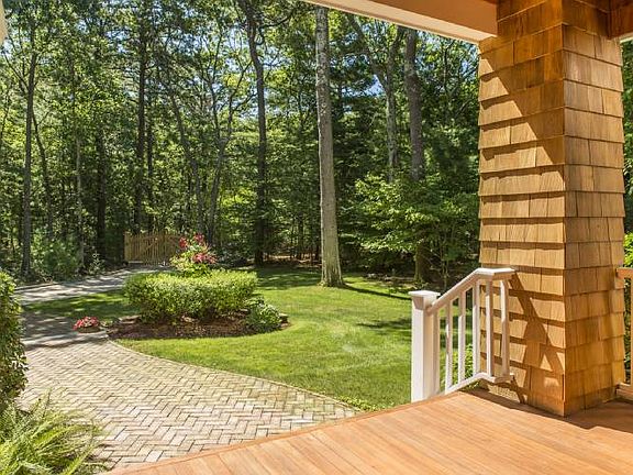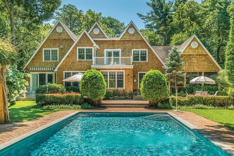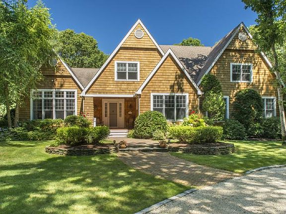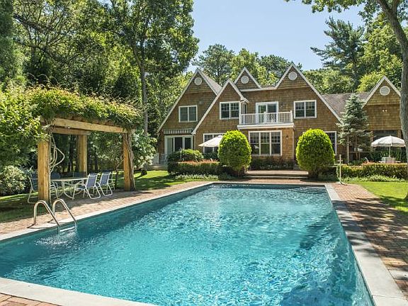 This lovely home on 2.3+/- acres of beautifully landscaped property close to East Hampton Village has been carefully maintained since completed by Forst and Silverblank Builders in 1999. The two-story shingle clad home has a double height living room with a fireplace, formal dining, a den with old wood beamed ceilings and a wet bar, an eat-in kitchen and a screened porch. The first floor master suite has a gas fireplace, an adjoining office, two walk-in closets and a large bathroom. Two of the four second floor guest bedroom suites share a large terrace. Other amenities include an attached two-car garage, laundry room, full height basement ready to be finished, central air conditioning, security and irrigation systems, a gated entrance and a heated gunite pool.