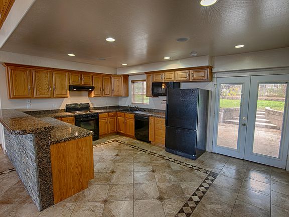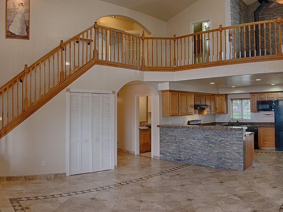 Come and claim your castle! This gorgeous 5 bedroom+ den, 3 bath home has room for everyone. This open great room floorpan is perfect for family gatherings or entertaining and has a well appointed kitchen featuring granite tile counter tops, breakfast bar, gas stove, plenty of oak cabinets, a pantry and more. There's a perfect balance of beauty and function with this home. The detail in the tile, inlays, and stone masonry work throughout is incredible. Maintain comfort and cost as this home has not one, but two thermostat/AC controls operating each side of the house. There's a lovey loft space with a woodstove perfect for the cozy, book worm nook. The home also features a speaker system throughout! Want to spend time outside? Enjoy the two balconies or the manicured yard and fruit trees
