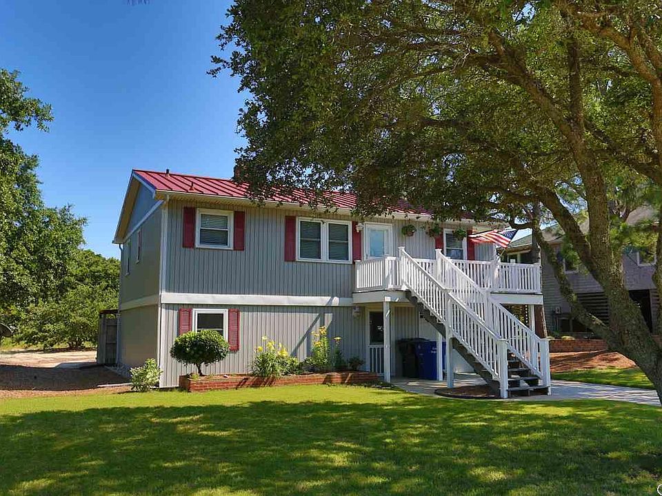 Perfect beach box has been modernized with low maintenance materials including metal roof, trex decking, vinyl railings and vinyl siding. The kitchen is bright, happy and open with clean white cabinets and appliances. The brick fireplace is the focal point of the great room which boasts beautiful hardwood floors. Cheerful paint colors and updated fixtures allow you to relax and not have to renovate. The backyard is spacious and there should be room for a pool. This 3 bedroom, 2 bathroom home also has a rare huge garage/workshop downstairs all done with permits. 2014 Carrier Heat Pump. Walk to the sound access just a few houses away. Homeowners on this street can join the Old Nags Head Cove Association and enjoy the outdoor community sound front pool. This is an ideal location close the the Outer Banks Hospital, great shopping, popular restaurants, fishing piers and Bodie Island Lighthouse.