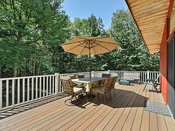 Tucked in the woods in one of the premiere communities in the Berkshires,this rustically elegant home inspired by mid century design is the perfect country retreat,or full time dwelling.The open plan kitchen,dining and living room w/glass all around & access to the expansive newly built composite wrap around deck are just some of the features that make this property appealing.Other features include a floor to ceiling brick fireplace,hdwd floors throughout the main level w/bdrm & guest bath & a lower level with primary suite & 2 more guest bdrms.Newer roof and rebuilt composite deck allows for years of worry free living.5+ acres w/beautiful perennial gardens,your own spring fed pond below & Jacobs Pillow just around the bend complete the picture & make this property exceedingly desirable SELLERS WILL INSTALL A NEW SEPTIC SYSTEM BEFORE CLOSING