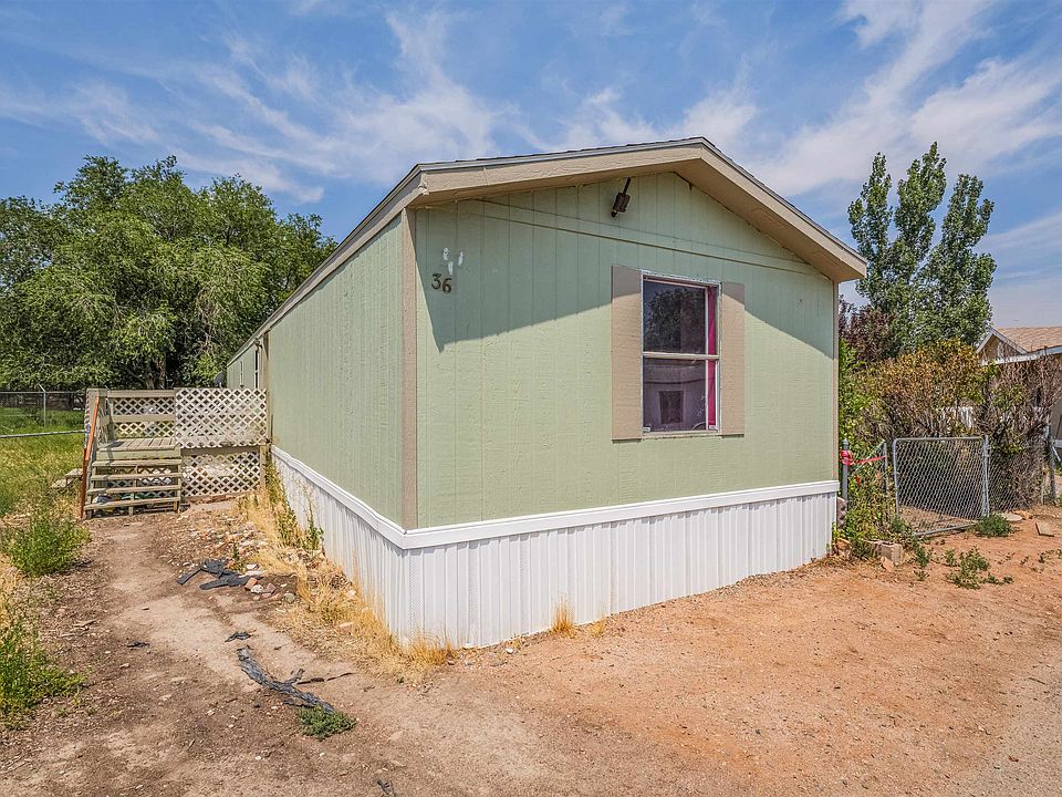 Don't miss this affordable gem nestled at the end of a quiet cul-de-sac in Applewood Estates MHP. Sitting on one of the largest lots in the park, this home offers privacy, space, and functionality—perfect for pet lovers, gardeners, or anyone needing extra room to spread out. Enjoy a split floor plan with a spacious living room, a full kitchen with gas stove, and plenty of cabinet space for all your cooking essentials. A newer evaporative cooler keeps the home comfortable in the warmer months and a newer roof (2025) gives you future peace of mind. The fully fenced yard includes an extra storage shed and a charming playhouse—ideal for hobbies, play, or even a creative retreat. Irrigation water keeps your yard lush and green, and pets are welcome with park approval. This is a rare opportunity to own a manufactured home on a lot this size in a quiet, established neighborhood. Schedule your showing today!