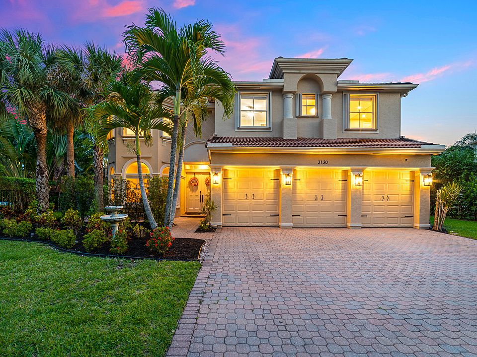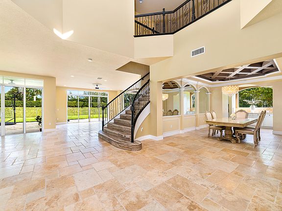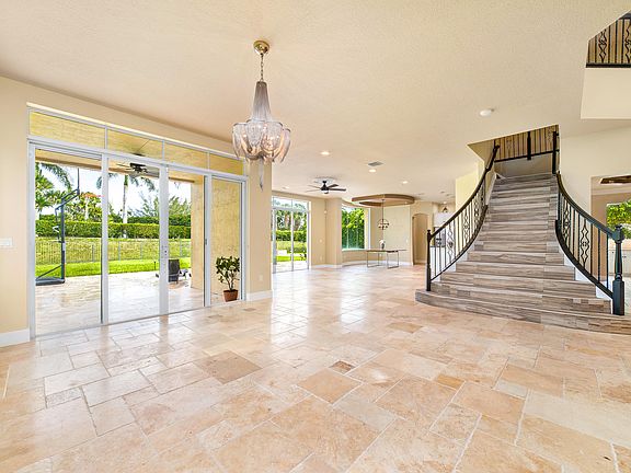 Over $200k was spent in upgrading this 5 (potential 6) bedroom, 5.5 bath Olympia home which includes a 3 car garage. Travertine Stone flooring throughout the main living areas on the first floor are set in a Versailles Pattern. EVERY bathroom in this home has been updated! The downstairs bedroom/flex room features laminate flooring and a double door entry. The formal dining room has rope light to showcase the coffered ceiling, in addition to the Chandelier. The remodeled kitchen features double ovens, a microwave drawer and custom cabinet doors, and a new large center island. The large walk-in pantry is filled with custom pull-outs and shelving. Upstairs, the split floor plan ensures privacy and convenience for all residents. The private primary suite features a flex space, balcony, 2 walk-in closets and a fully mirrored area. The elegantly REDESIGNED primary bath features custom vanity, stand alone soaking tub and large glass-enclosed shower with dual shower heads. Additionally, the second floor is equipped with a convenient laundry room. This private, pie shaped lot offers room for a pool (cabana bath already waiting) and is fully fenced to keep your furry friends close. Upgraded Travertine paver patio extends to a separate firepit area. Olympia is a man-gated community surrounded by lakes and wetland preserves. In the clubhouse you'll find meeting rooms, a fitness center with a child's playroom and an indoor basketball and volleyball court. Adjacent to the clubhouse, is the community resort-style pool, spa, children's splash area, tennis courts, pickleball courts, outdoor basketball and sand volleyball courts, and tot lot. Centrally located near all things Wellington.