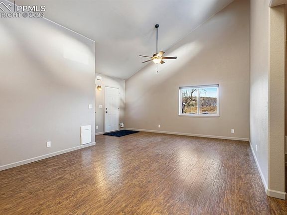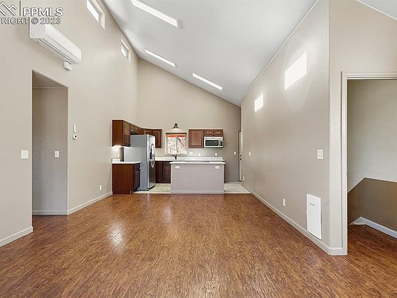 Attention aspiring Colorado Springs homeowners! This property offers an exceptional opportunity to own a unique 1728 sq.ft. garage/workspace designed as more than just a space—it's a lifestyle hub tailored for automotive enthusiasts, craftsmen, and hobbyists. Imagine a fully-equipped kitchen featuring Corian counter tops, under-counter lighting, refrigerator, microwave, dishwasher, and range oven. Accompanied by a 3/4 bath boasting exquisite tiled shower and flooring, radiant floor heating, and a ceiling fan, it's an ideal workspace with ample room for multiple lifts—a space Certified for Occupancy, allowing for easy conversion. Embrace versatility with an 8 ft standard door and a larger 10 ft door, perfect for your RV. Enhanced by epoxy flooring and an external 50 amp RV plugs, it's tailored for larger vehicles or equipment. Transitioning to the main living unit, discover a blend of comfort and elegance. Vaulted ceilings and a ceiling fan in the living room and dining area create an inviting atmosphere. Luxury vinyl and tile flooring, coupled with 6-panel doors, add sophistication. The kitchen is a culinary paradise, featuring a tile floor, pantry, island, solid-surface countertops, under-counter lighting, and stainless-steel appliances. Step onto the covered 18x8 balcony from the kitchen for breathtaking city and mountain views. This home ensures year-round comfort with radiant floor heating and a mini-split cooling system. Its exterior boasts stucco walls, a durable metal roof, and a partial wood fence, achieving both aesthetics and functionality. Low-maintenance landscaping adds to its appeal. Experience the enchantment of Colorado Springs living—a blend of practicality and luxury awaits you in this exceptional property!