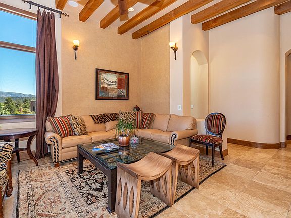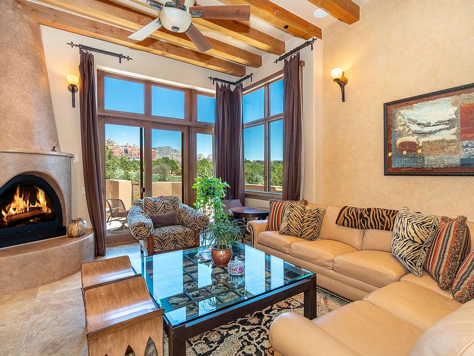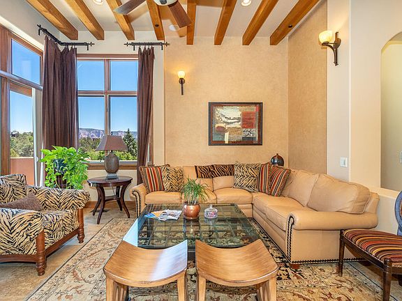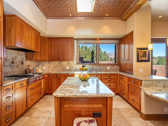 Custom contemporary Southwest home sits on an elevated private view lot with unobstructed red rock views.No expense was spared in building.This comfortable Open floor plan displays quality with a one-of-a-kind beauty.Located on the crease of the red rocks in the heart of West Sedona.Walk in and say WOW!The Library/Den/Office close to the entrance has a built in rich cherry wood bookcase on one side and many windows on the other side.All doors are made out of Knotty Alder and are 8' in heigth and most with an ADA 3' width compliance.The living room is light and bright with amazing red rock views, a 12' high ceiling with exposed wood beams, a kiva gas fireplace and a deck with amazing red rock views.The intimate dinning room flows between the living room(see additional remarks).