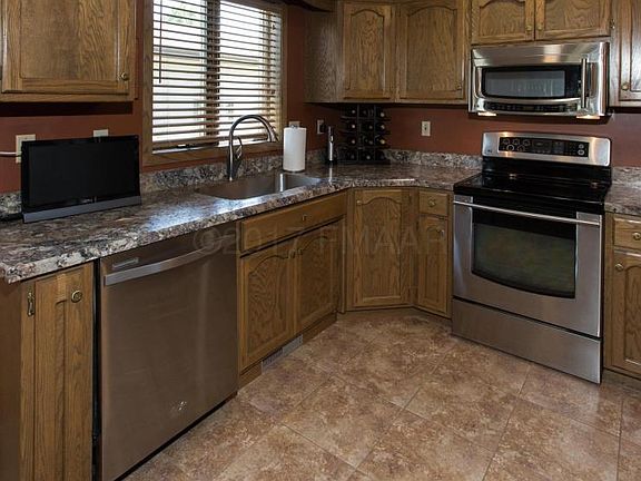 Highly sought after rambler twin in North Fargo. Delightfully updated and move-in ready. Eat-in kitchen has dura ceramic tile floors, HD countertops and newer ss appliances. You'll enjoy entertaining in the open living room/formal dining area with patio door to deck and nicely landscaped back yard. Main floor bath has HD counters, double sinks and Jacuzzi tub. Downstairs you'll find a large family room with fireplace, a 3rd bedroom and additional room for crafts/office or storage.Lower bath has maple cabinets and HD laminate counters.