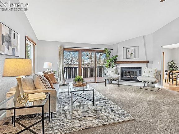 Welcome to this private, corner top-floor unit in the HIGHLY desirable Villa Pourtales!!! This home features vaulted ceilings, a BEAUTIFUL corner fireplace, and large sliding glass doors that lead to a private deck where you can take in the EXPANSIVE FRONT RANGE featuring Cheyenne Mountain!! Views are also easily enjoyed the living and dining area as well! Recent updates include AC, fresh paint, newer carpet, and updated flooring, creating a clean and inviting space!! This beautiful floorplan offers a seamless flow between the living area, kitchen, and outdoor deck, perfect for relaxing or entertaining!! Additional highlights include a 2-car garage, offering ample storage and convenience. Enjoy all the benefits of living in this well-maintained community, surrounded by natural beauty and easy access to local amenities in highly desirable 80906! MOVE IN READY!! COME CHECK US OUT TODAY!!