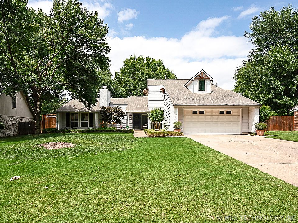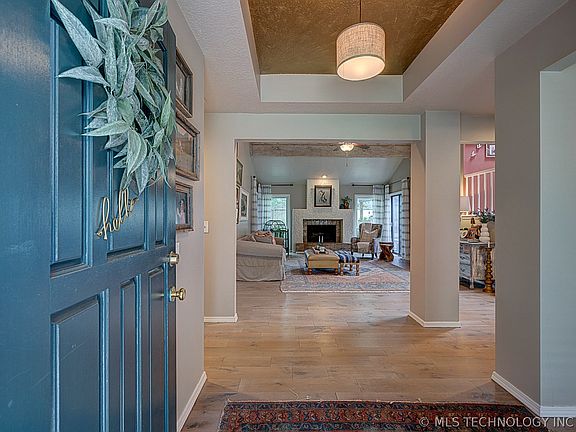 Beautifully updated contemporary on oversized lot in desired Jenks Schools. Vaulted & beautiful beamed ceilings & new white oak flooring. Eat-in kitchen w/stunning marble & butler's pantry opening to family room w/fireplace. Spacious 1st floor master offers an inviting FP & double vanities w/new granite. Casual & formal dining and 1st floor office with built-ins. 2 large bedrooms and darling game room up. Amazing private backyard oasis w/outdoor kitchen, screened in gazebo & 16x20 workshop w/AC. Must see!