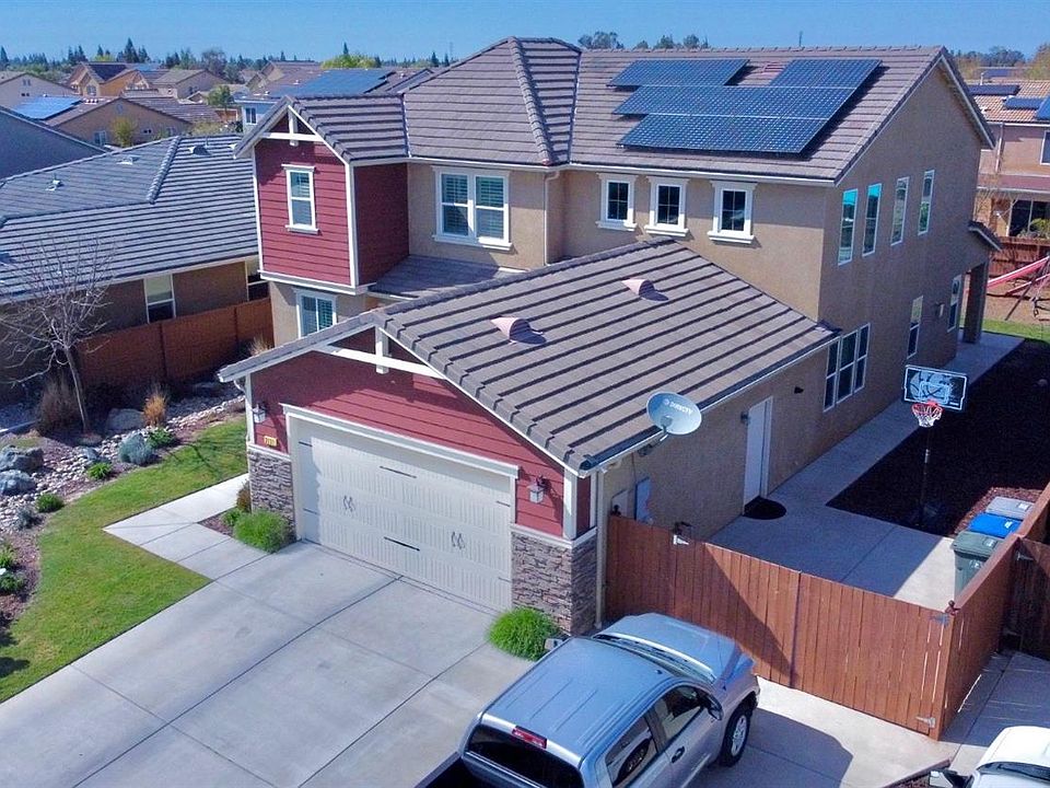 Huge Price Reduction!!!Spacious kitchen with granite counters, Upgraded Subway backsplash, Stainless Steel appliances including Double Ovens, 5-burner gas stove, Dishwasher and Pantry. With adjoining Breakfast nook. Opens to large Family room with gas fireplace and views of large back. Great for BBQ's and entertaining. Upgrades Include gorgeous Wood Plank Flooring throughout except bedrooms and upstairs hallway, Plantation Shutters, Ceiling fans, Whole house fan and Tile Roof.Oversized upstairs Primary bedroom with Spacious Ensuite has granite counters, two sinks, soaking tub with separate shower and huge walk-in closet.Three additional upstairs bedrooms with one full bathroom includes two sinks. Two downstairs bedrooms with full bathroom. Energy efficient with owned Solar, Dual-zoned HVAC system. RV/Trailer parking. Pool sized lot.Perfectly situated in the award-winning Clovis Unified School District near two parks, and walking trails! Schedule your appointment today to tour this beautiful, spacious home!