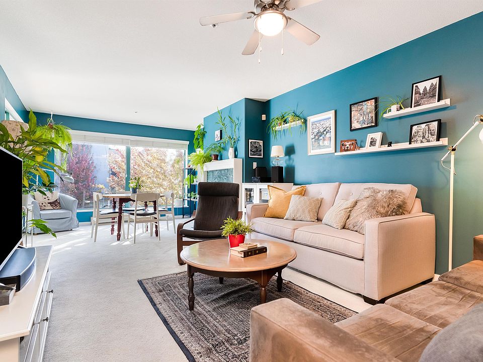 Welcome Home to Cartier Place; an exceptional location in the heart of Mount Pleasant at 16th and Main. Over 780 sqft of functional living space in this spacious 1 bed & den home. You'll love the cozy gas fireplace in the living room, in-suite laundry and partial mountain views. Primary suite is large w/ plenty of room for a king size bed. Den is bright & sunny with eastern exposure, perfect for your home office or nursery! Updated bathroom can be accessed from both the living & bedroom and there's tons of storage throughout. Unbeatable location steps to the best restaurants, groceries, the Mount Pleasant Community Centre, parks and transit. 1 parking & 1 storage included plus a common bike room. Our pleasure to show!