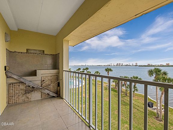Desirable RIVERFRONT penthouse 2 bed / 2 bath condominium on the Halifax River, also known as the Intracoastal Waterway. This gorgeous unit has been remodeled and decorated with a coastal flare and is being sold furnished. The kitchen has many cabinets, plenty of space to work & a COOL butcher block counter extension. An open floor plan from the kitchen, dining and through to the living room. The Daytona MLS shows only one unit sold in 2022. WHY? This building is meticulously maintained, has a low $379 per month fee & who doesn't want to see sunrises 365 days a year? Lounge by the pool, watch the dolphins play, take your kayak for a spin or hang out by the fire pit.