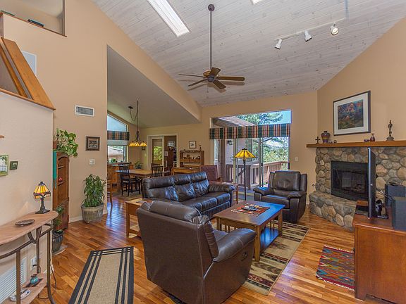 Are you looking for that perfect get-away or full time residence in the majestic pines of Prescott? This beautiful home is tucked away in the well established Kingswood community just minutes from downtown Prescott, dining and shopping. Entering the home you are greeted by sky-high ceilings, Brazilian Rosewood floors, and the stunning rock fireplace. The bright clean kitchen features stainless steel appliances and opens to the dining area with plenty of peninsula seating. The master bedroom is conveniently located on the main level along with a den and powder room. Two bedrooms and a full bath are located on the second level. The spacious master suite has a large vanity with two sinks, garden tub, and stand-up shower. All central living spaces, including the master, (see Supplement)