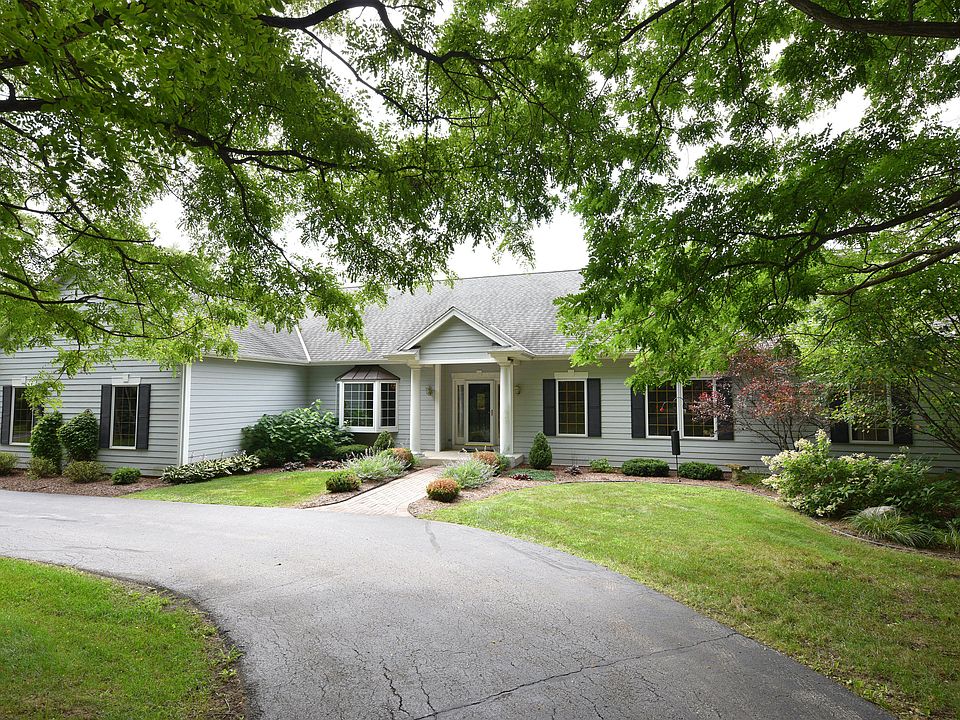 Located off of a private drive, be wowed by this custom ranch with walk-out lower level. Nestled on 3+ acres, enjoy expansive, spectacular western views, stunning sunsets, walking paths & large new fenced area. Entertain with ease in the open concept floor plan. Every room enjoys exceptional views. The gourmet kitchen features a new Wolf cooktop & walk-in pantry. Stunning dining room boasts abundant storage with beautiful built-ins. Spend quiet moments in the 3 season room and listen to the lovely water feature located right outside. Retreat to the master suite with separate sitting area w/cozy fireplace, enjoy access to your rear balcony & appreciate the en suite bath with large tub & walk-in shower. The lower level features 2 bedrooms, full bath & tremendous rec space. A MQ jewel!